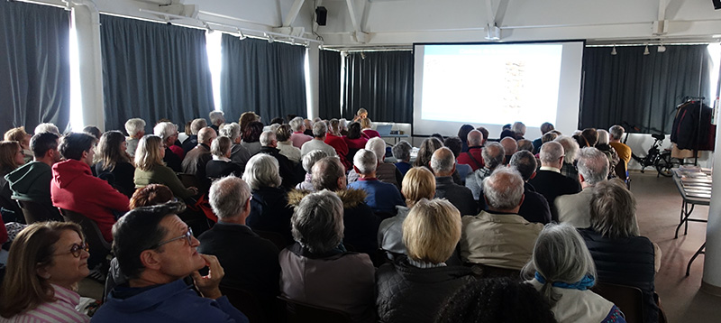Soleil magnifique, samedi 28 mars 2026, pour la conférence proposée par Françoise Desmonts sur la thématique de cette pierre, abondante dans certaines régions dont le Bassin Parisien, et en conséquence bien présente dans le paysage triellois. Un temps propice donc pour donner à la très nombreuse assistance (pas une chaise de libre!) l’occasion d’approfondir nos connaissances sur ce matériau tellement vivant sous les rayons de notre étoile…